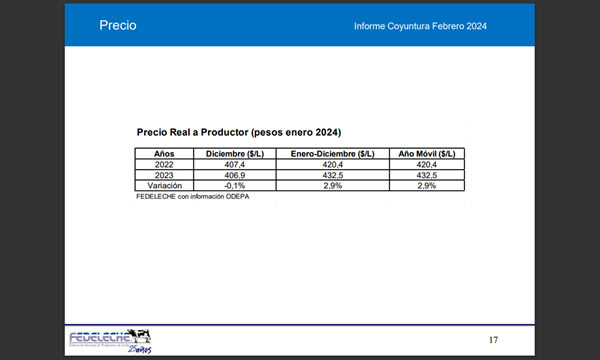 En el duodécimo mes de 2023, el precio a productor cae un 0,1% respecto al mismo mes de 2022, equivalente a $0,47 por litro, al bajar de $ 407,37 a $ 406,90.