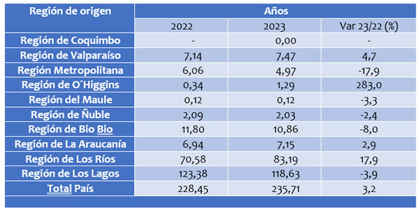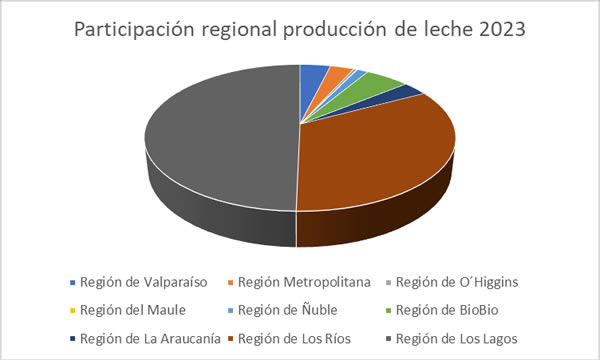 En la región de Los Lagos, la producción de leche presentó durante 2023 una variación negativa de 5,0% en relación con el año anterior, acumulando una caída anual de 56,7 millones de litros, de 1.129,38 a 1072,66 millones de litros. La región de Los Lagos se mantiene como la principal zona productora de leche a nivel nacional al concentrar un 49,7% de la producción.