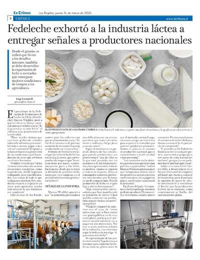 El presidente de la Federación de Productores de Leche de Chile (Fedeleche), Marcos Winkler, instó a que la industria láctea nacional entregue señales claras 'de si quieren o no más leche' al referirse a las proyecciones de la actividad. 'Hace mucho tiempo que venimos pidiendo señales sobre si la industria quiere recibir más o menos; pagar más o menos', comentó el dirigente, a la hora de hacer una proyección de las condiciones para la producción de leche que avizoran un alza en los costos.