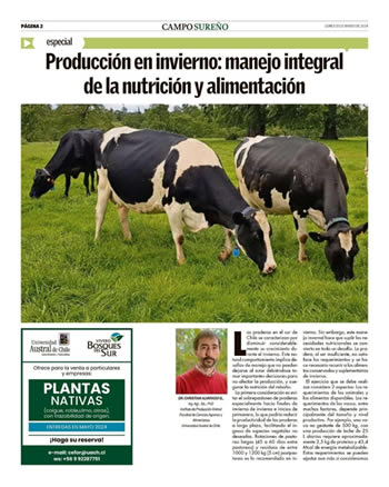 Sin embargo, este manejo invernal hace que suplir las necesidades nutricionales se convierta en todo un desafío. la pradera, al ser insuficiente, no satisface los requerimientos y se hace necesario recurrir a los alimentos conservados y suplementarios de invierno. El ejercicio que se debe realizar considera 2 aspectos: Los requerimientos de los animales y los alimentos disponibles. Los requerimientos de las vacas, entre muchos factores, depende principalmente del tamaño y nivel productivo. Por ejemplo, una vaca no gestante de 500 kg, con una producción de leche de 25 diarios requiere aproximadamente 2,5 kg de proteína y 43,4 Mcal de energía metabolizable. Estos requerimientos se pueden ajustar aun más si consideramos la calidad de la leche producida (contenido graso), la posible ganancia o pérdida de peso del animal y también otros nutrientes, como minerales, o mínimo contenido de Fibra.