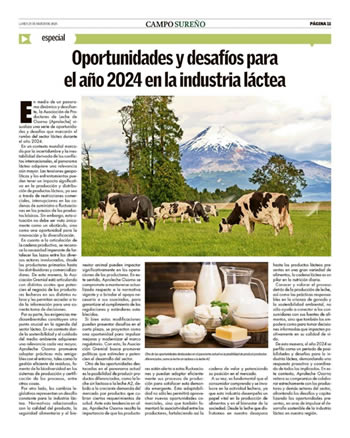 Conocer y valorar el proceso detrás de la producción de leche, así como las prácticas responsables en la crianza de ganado y la sostenibilidad ambiental, no sólo ayuda a conectar a los consumidores con sus fuentes de alimentos, sino que también los empodera como para tomar decisiones informadas que impacten positivamente en su calidad de vida. De esta manera, el año 2024 se perfila como un periodo de posibilidades y desafíos para la industria láctea, demandando una respuesta proactiva y coordinada de todos los implicados. En este contexto, Aproleche Osorno reitera su compromiso de colaborar estrechamente con los productores y demás actores del sector, afrontando los desafíos y capitalizando las oportunidades presentes, en aras de impulsar el desarrollo sostenible de la industria láctea en nuestra región.