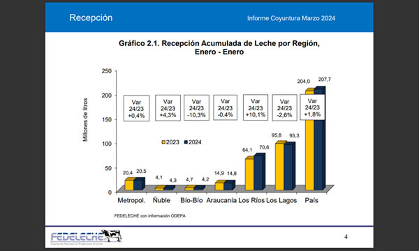 En la región de Ñuble, la variación en recepción de leche es al alza con un avance de 4,3% respecto del año anterior, subiendo de 4,1 a 4,3 millones de litros, lo que supone 200 mil litros adicionales.