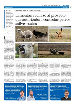 El presidente de la Multigremial Nacional, Juan Pablo Swett, criticó que 'lamentablemente, con la mirada centralista que tiene el Congreso, desconoce la realidad que viven miles de pequeños agricultores y emprendedores del sur'. 'Los ataques de los perros asilvestrados los hace perder casi el 10% del trabajo de todo un año', afirmó. Swett adelantó que 'hoy vemos la completa desprotección en la que quedarán rubros fundamentales para la economía de las regiones'. 'Los parlamentarios no consideran la inversión que tienen que hacer las pymes en seguridad para prevenir estos ataques reiterativos'.