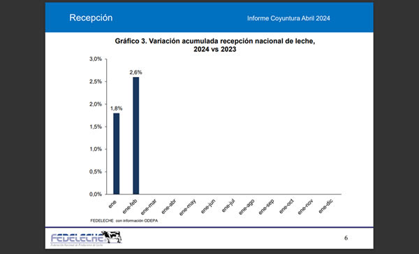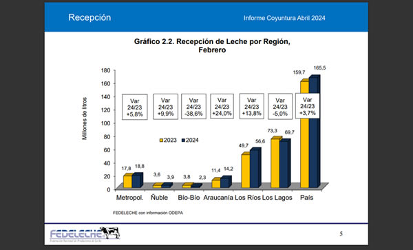 De acuerdo a los datos divulgados por la Federación Nacional de Productores de Leche (Fedeleche) en base a los antecedentes liberados por la Oficina de Estudios y Políticas Agrarias (Odepa), la recepción nacional de leche cruda en enero – febrero de 2024 registra un aumento de 2,6% en comparación al mismo periodo de 2023, totalizando 373,3 millones de litros.