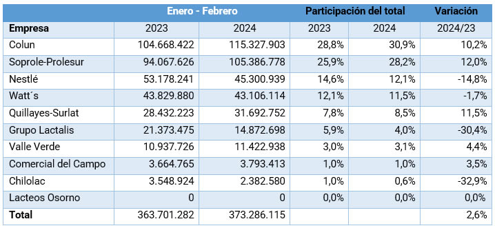 La recepción nacional de leche cruda es liderada por Colun con una participación que supone un 30,9% dentro del total. La cooperativa presenta el primer bimestre del año un aumento de 10,2% frente al año anterior, registrando un total de 115,3 millones de litros, lo que a su vez equivalente a 10,6 millones de litros por sobre 2023.