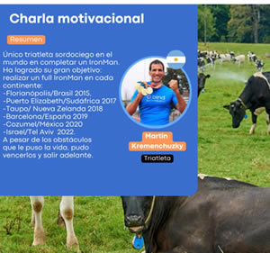 El bloque de cierre tendrá la Charla Motivacional de Martin Kremenchuzky, ingeniero en sistemas, triatleta sordociego y conferencista internacional, quien compartirá sus experiencias de aprendizaje, apelando a la resiliencia y a reflexionar sobre la actitud como manera superar las adversidades más difíciles.