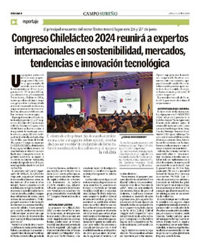 Osorno 06 de junio de 2024.- Un programa potente de actualización y perspectivas que atiende los desafíos y oportunidades de los productores de leche y la cadena láctea en Chile es la propuesta de la 10° versión del Congreso Internacional y Exposición del Sector Lácteo, Chilelácteo 2024, evento que ofrece al mismo tiempo una gran exhibición ferial, donde más de 40 reconocidas instituciones, empresas nacionales e internacionales afines al desarrollo del rubro exhiben sus servicios y tecnologías.