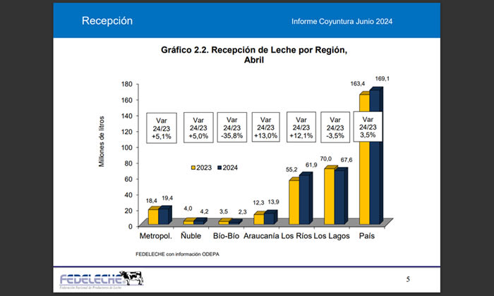 De acuerdo a los datos divulgados por la Federación Nacional de Productores de Leche (Fedeleche) en base a los antecedentes liberados por la Oficina de Estudios y Políticas Agrarias (Odepa), la recepción nacional de leche cruda en enero – abril de 2024 registra un aumento de 1,8% en comparación al mismo periodo de 2023, totalizando 708,2 millones de litros.