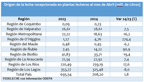 La producción de leche en la Región de La Araucanía concluye al mes de Abril con un aumento de 7,4% frente al mismo periodo de 2023, lo que se traduce en un alza de 1,5 millones de litros, subiendo de 21,34 a 22,92 millones de litros, volumen que representa el 3,2% dentro del total nacional.