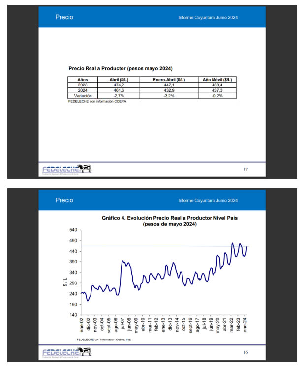 En el cuarto mes de 2024, el precio a productor cae 2,7% respecto al mismo mes de 2023, equivalente a $12,59 por litro, al bajar de $ 474,1 a $461,5.