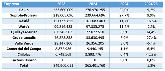 En los cinco meses de 2024 destaca el liderazgo de Colun y Soprole, y el aumento de Quillayes-Surlat