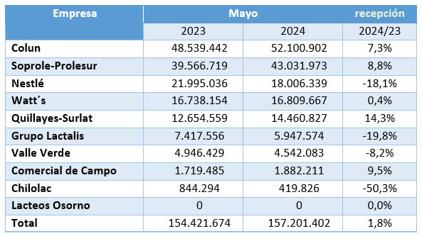 En el quinto mes del año, la recepción de leche de la industria láctea mayor sumó 157,2 millones de litros, volumen que se traduce en un alza de 1,8%, equivalente a 2,7 millones de litros.