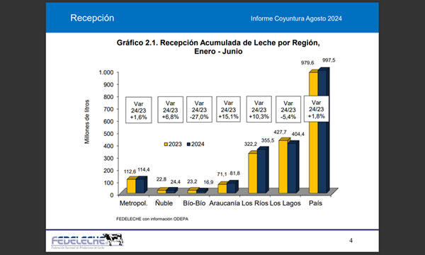 De acuerdo a los datos divulgados por la Federación Nacional de Productores de Leche (Fedeleche) en base a los antecedentes liberados por la Oficina de Estudios y Políticas Agrarias (Odepa), la recepción nacional de leche registró el primer semestre de 2024 un aumento de 1,8% en comparación con el mismo periodo de 2023, totalizando 997,5 millones de litros.
