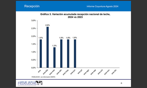 Durante lo que va del año, desde enero hasta junio, la producción de leche cruda en el país registra un alza de 1,8% respecto del mismo periodo de 2023.