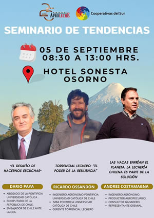 El próximo 5 de septiembre, a partir de las 09:00 Hrs., el Hotel Sonesta de Osorno será el escenario del VIII Seminario de Tendencias 2024, una destacada iniciativa organizada por la Asociación Gremial de Productores de Leche de Osorno (Aproleche Osorno) en colaboración con la Asociación Gremial de Cooperativas del Sur. Este evento reunirá a importantes actores del sector lácteo y cooperativo para abordar las tendencias actuales del mercado y las nuevas oportunidades para los productores lecheros.