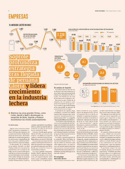 'La situación recién explicada para 2023 es una consolidación del liderazgo en el crecimiento de Soprole en la recepción de leche cruda nacional, donde el país para los dos últimos años disminuye su recepción en un 4,8% mientras Soprole y sus filiales, en igual período, la aumenta en un 19,7%', dijo el directivo.