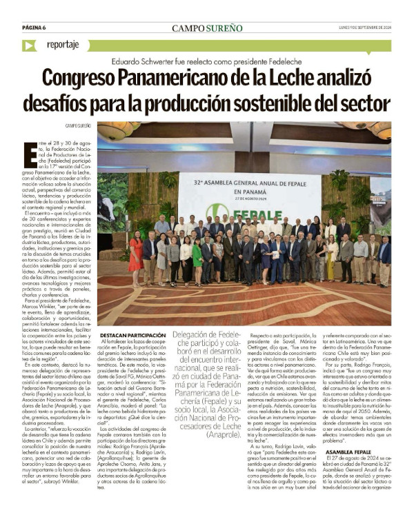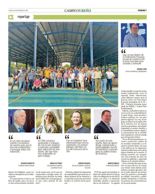 Al fortalecer los lazos de cooperación en Fepale, la participación del gremio lechero incluyó la moderación de interesantes paneles temáticos. De este modo, la vicepresidente de Fedeleche y presidente de Saval FG, Mónica Oettinger, moderó la conferencia: 'Situación actual del Gusano Barrenador a nivel regional', mientras el gerente de Fedeleche, Carlos Arancibia, moderó el panel: 'La leche como bebida hidratante para deportistas: ¿Qué dice la ciencia?'. Las actividades del congreso de Fepale contaron también con la participación de los directores gremiales: Rodrigo François (Aproleche Araucanía) y, Rodrigo Lavín, (Agrollanquihue); la gerente de Aproleche Osorno, Anita Jans, y una importante delegación de productores socios de Agrollanquihue y otros actores de la cadena láctea.