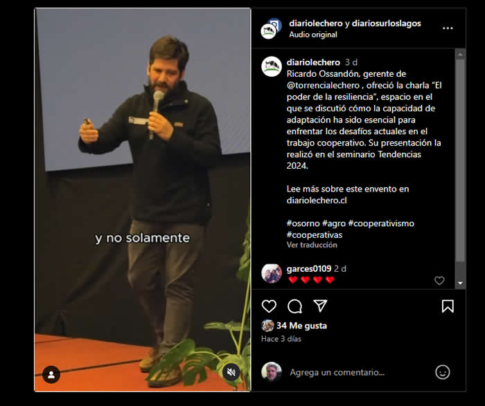 En la reciente edición del seminario Tendencias 2024, Ricardo Ossandón, gerente de Cooperativa Torrencial Lechero compartió parte de la historia de la organización. En el encuentro Tendencias 2024 organizado por Aproleche Osorno y Cooperativas del Sur, el ingeniero agrónomo conversó con los asistentes sobre el crecimiento, sus hitos y los periodos más complejos que han vivido.