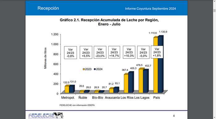 En Los Ríos aumentó la recepción de leche cruda se elevó +4,4% respecto del mismo mes de 2023, alcanzando un volumen total de 49,7 millones de litros, lo que representa un incremento de 4,6 millones de litros.