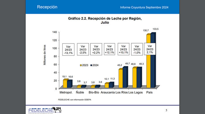 En el séptimo mes del año, la recepción nacional de leche cruda presentó un aumento de 2,1% respecto del mismo mes del año anterior, alcanzando un total de 133,5 millones, lo que supone un alza de 2,8 millones de litros.