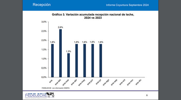 En el arranque del segundo semestre, desde enero hasta julio, la recepción de leche cruda del país se eleva 20,3 millones de litros respecto del mismo periodo de 2023.
