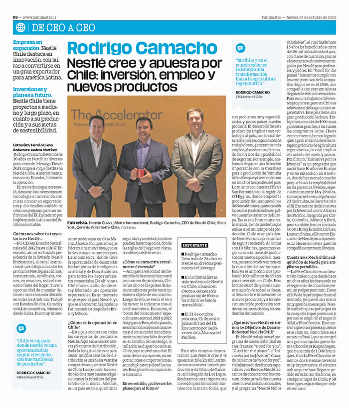 Rodrigo Camacho lleva más de 20 años en Nestlé en diversas posiciones de liderazgo. Desde 2023 ocupa el cargo de CEO de Nestlé Chile. Anteriormente, estuvo en Ecuador, liderando la operación. Entre los datos que nos reveló, destacan las inversiones en tecnología e innovación con miras a crecer en exportaciones y dio detalles también de cómo se preparan para ser anfitriones del IX Encuentro por los Jóvenes de la Alianza del Pacífico en octubre.