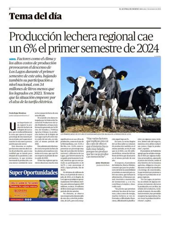 AGRO. Factores como el clima y los altos costos de producción provocaron el descenso de Los Lagos durante el primer semestre de este año, bajando también su participación a nivel nacional, con 34 millones de litros menos que los logrados en 2023. Temen que la situación empeore por el alza de la tarifa eléctrica.