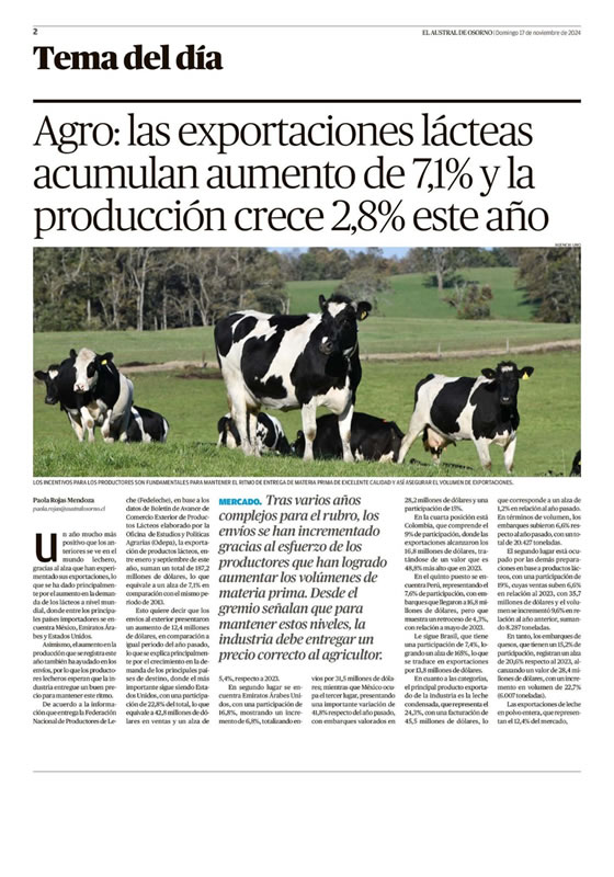 Un año mucho más positivo que los anteriores se ve en el mundo lechero, gracias al alza que han experimentado sus exportaciones, lo que se ha dado principalmente por el aumento en la demanda de los Lácteos a nivel mundial, donde entre los principales países importadores se encuentra México, Emiratos Árabes y Estados Unidos.