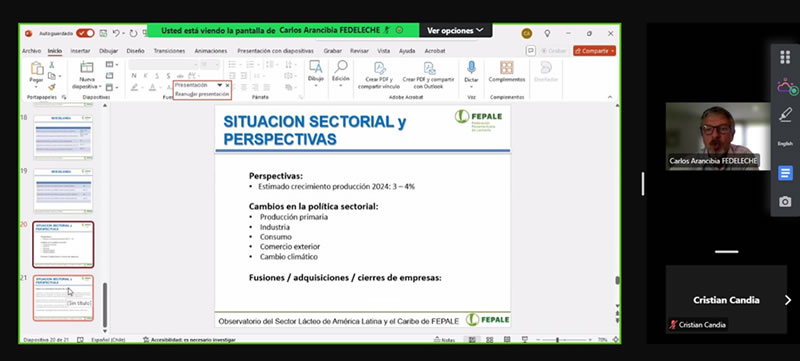 En una jornada de presentación y recolección de datos para el Observatorio Lácteo de la Federación Panamericana de Lechería (Fepale), realizada este miércoles 13 de noviembre de 2024, el gerente de Fedeleche, Carlos Arancibia, expuso la situación de la producción láctea en Chile.
