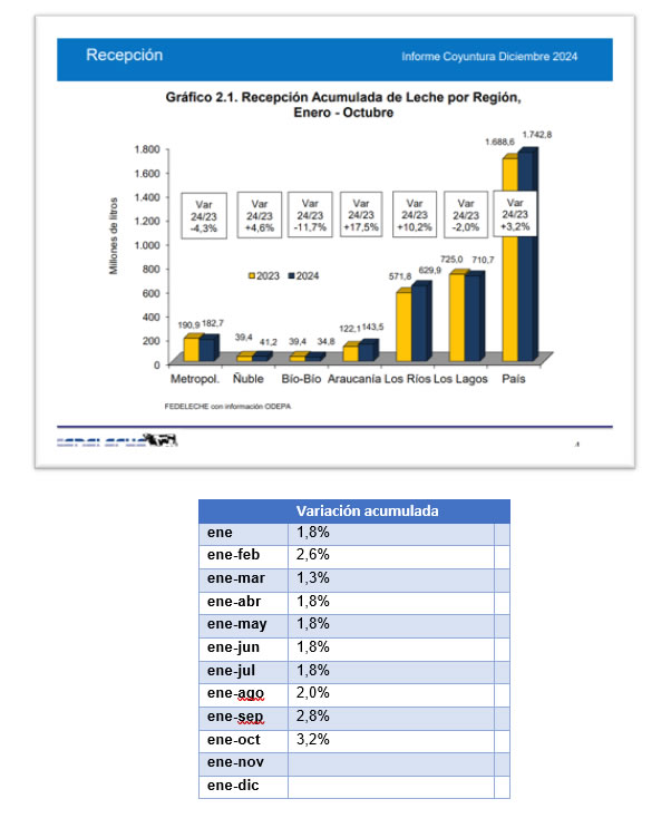 De acuerdo a los datos divulgados por la Federación Nacional de Productores de Leche (Fedeleche), en base a los antecedentes liberados por la Oficina de Estudios y Políticas Agrarias (Odepa), la recepción nacional de leche cruda, desde enero hasta octubre de 2024, se incrementó 3,2% en comparación con el mismo periodo de 2023, totalizando 1.742,8 millones de litros. Lo anterior, representa un avance interanual de 54,2 millones de litros.