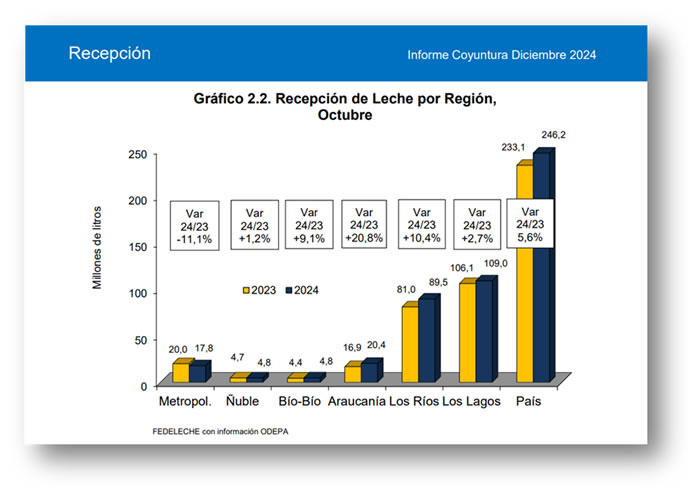 En la región de Los Ríos, que supone un 36,1% sobre el total, la recepción de leche cruda anotó una variación alza de 10,2% respecto de 2023, subiendo de 571,8 a 629,9 millones de litros, lo cual supone una alza interanual de 58,1 millones.
