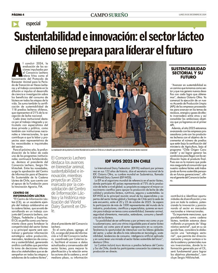 El Consorcio Lechero destaca los avances en bienestar animal, sustentabilidad e innovación, mientras proyecta un 2025 marcado por la consolidación del Centro de Información Láctea y la histórica realización del World Dairy Summit en Chile.