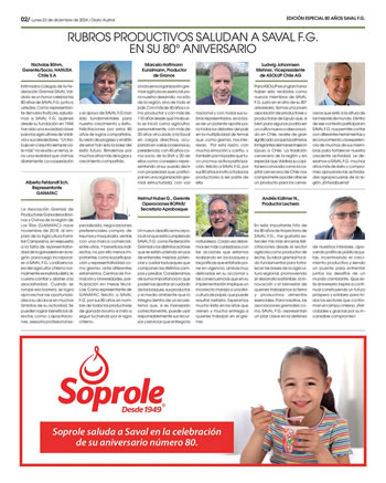 Estimados colegas de la Federación Gremial SAVAL Valdivia: es un honor celebrar los 80 años de SAVAL F.G. junto a ustedes. Como representante del rubro frutícola, saludamos a SAVAL F.G. quienes desde su fundación en 1944 han sido una sociedad clave para los agricultores de Valdivia y sus alrededores. 'Un trabajo en conjunto siempre vale más' no es sólo un lema, sino una realidad que vivimos diariamente. La cooperación y el apoyo de SAVAL F.G. han sido fundamentales para nuestro crecimiento y éxito. Felicitaciones por estos 80 años de logros compartidos. Su visión de progreso y el afán de servir han sido la base del éxito futuro. Brindemos por muchos años más de logros y crecimiento compartido.