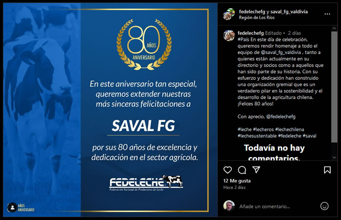 En este importante hito de los 80 años de trayectoria de SAVAL F.G., me gustaría extender mis más sinceras felicitaciones desde el sector agrícola como productor de leche. Su labor gremial ha sido fundamental para fortalecer las bases de la agricultura regional, promoviendo el desarrollo sostenible, la innovación y el bienestar de quienes trabajamos la tierra y producimos alimentos esenciales. Para nosotros, las asociaciones gremiales como SAVAL F.G. representan un pilar clave en la defensa de nuestros intereses, apoyando políticas públicas justas, incentivando el crecimiento productivo y siendo un puente para enfrentar juntos los desafíos de un mundo cambiante. Que este aniversario inspire a continuar construyendo un futuro próspero y solidario para todos los sectores que conforman el campo chileno. ¡Felicidades y gracias por su incansable compromiso!