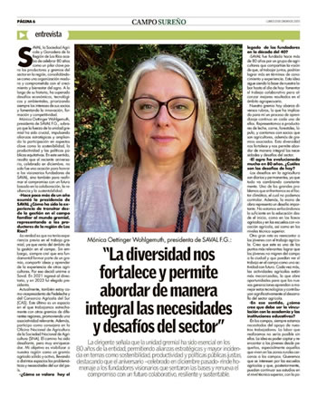 Mónica Oettinger Wohlgemuth, presidenta de SAVAL F.G.: "La diversidad nos fortalece y permite abordar de manera integral las necesidades y desafíos del sector". La dirigente señala que la unidad gremial ha sido esencial en los 80 años de la entidad, permitiendo alianzas estratégicas y mayor incidencia en ternas como sostenibilidad, productividad y políticas públicas justas, oestac,anc o que el aniversario —celebrado en diciembre pasado- rinde homenaje a los fundadores visionarios que sentaron las bases y renueva el compromiso con un futuro colaborativo, resiliente y sustentable.