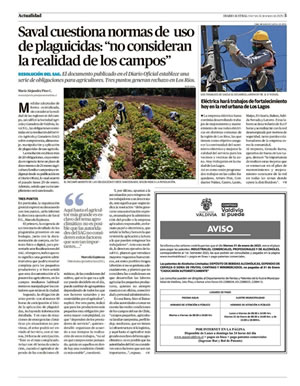 Medidas adoptadas de forma centralizada, sin considerar la realidad de las regiones ni del campo, así calificó la Sociedad Agrícola y Ganadera de Valdivia, Saval F.G., las obligaciones contenidas en la resolución del Servicio Agrícola y Ganadero (SAG) sobre compraventa, almacenaje, manipulación y aplicación de plaguicidas de uso agrícola.