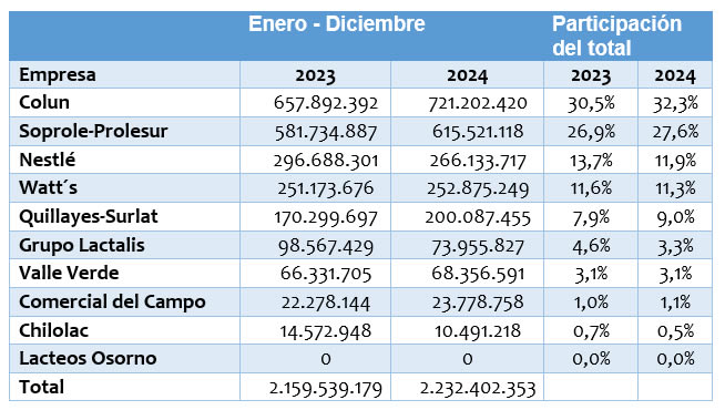 En este ejercicio, la recepción anual fue liderada por Colun, cuya participación dentro del total alcanzó 32,3%, lo que representa un avance respecto de 2023, cuando logró 30,5%.