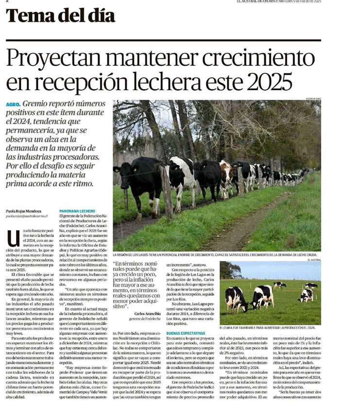 "Hay empresas como Soprole-Prolesur que tienen un aumento en la recepción, también Colun fue al alza. Hay otras plantas más chicas, como Comercial de Campo y Valle Verde que también tienen un aumento. Por otro lado, empresas como Nestlé tienen una disminución en la recepción o Chilolac. No todas se comportaron de la misma manera, lo que no significa que se vayan a comportar igual este 2025. Nestlé demostró que está interesado en recuperar parte de la producción que perdió el 2024, así que es esperable que este 2025 tengamos una recepción mayor que la del 2024 y se espera que las otras también tengan un incremento", sostuvo.