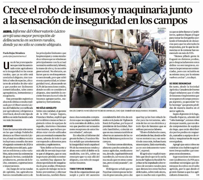 En tanto, desde la Sociedad Agrícola y Ganadera de Osorno (Sago) señalaron que el robo de insumos e implementos que se ocupan en el campo preocupa al gremio, ya que existe "robo hormiga" que genera pérdidas de manera masiva en el sector agrícola.