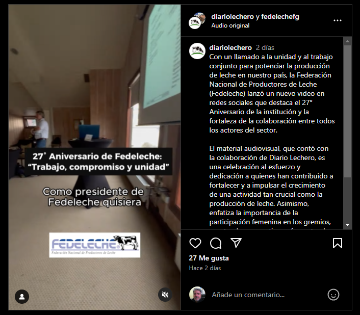 Con un llamado a la unidad y al trabajo conjunto para potenciar la producción de leche en nuestro país, la Federación Nacional de Productores de Leche (Fedeleche) lanzó un nuevo video en redes sociales que destaca el 27° Aniversario de la institución y la fortaleza de la colaboración entre todos los actores del sector.