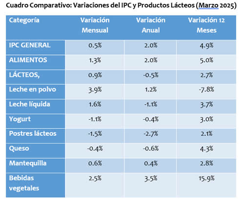 El informe, con antecedentes del Instituto Nacional de Estadísticas (INE), destaca que los productos lácteos no figuraron entre los alimentos con mayor incidencia alza, aunque algunos, como el yogurt y los quesos, aparecieron entre los alimentos con mayores incidencias a la baja, mientras que el IPC general de marzo registró una variación mensual de 0,5%.