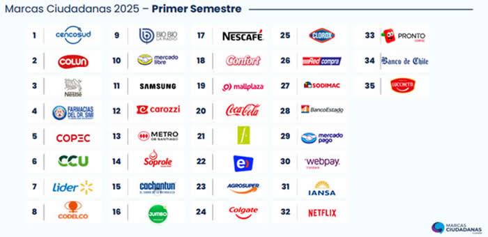Cada semestre, Cadem elabora un ranking que destaca a aquellas marcas con una percepción positiva en la opinión pública, gracias a su aporte a la sociedad y a su relevancia para los consumidores o clientes. Esta evaluación se basa en encuestas aplicadas a un panel de 600 personas.
