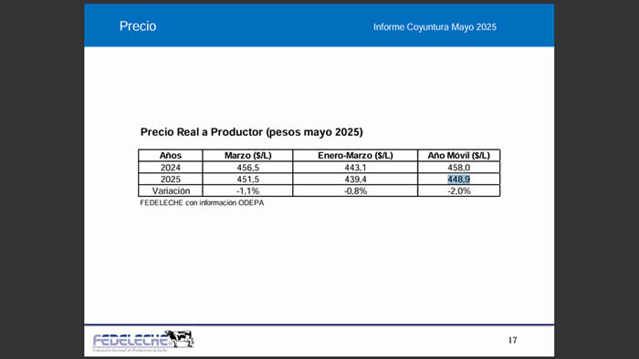 Los datos liberados por la Oficina de Estudios y Políticas Agrarias (Odepa), muestran que, a nivel nacional - el precio real por litro pagado al productor de leche en el periodo enero – marzo de 2025 disminuyó un 1,1%, pasando de $ 456,45 a $ 451,53 por litro.