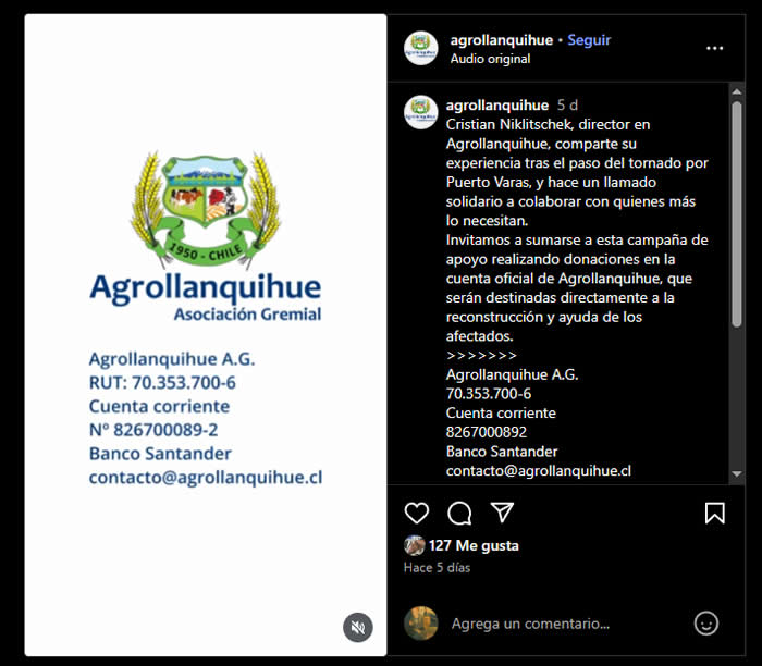 Se estarán recibiendo aportes en la cuenta corriente de Agrollanquihue para ir en apoyo de las familias de la comuna con materiales de construcción.