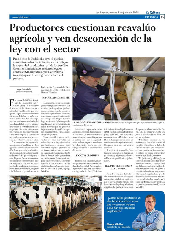 'La normativa establece claramente que el avalúo de predios agrícolas debe calcularse en función de su potencial productivo. No obstante, la metodología aplicada por el SII parece ignorar esta disposición, resultando en incrementos considerables que no reflejan la realidad de cada predio. Es una ley que desconoce la realidad productiva', aseguró a La Tribuna el presidente de la Federación Nacional de Productores de Leche (Fedeleche), Marcos Winkler.