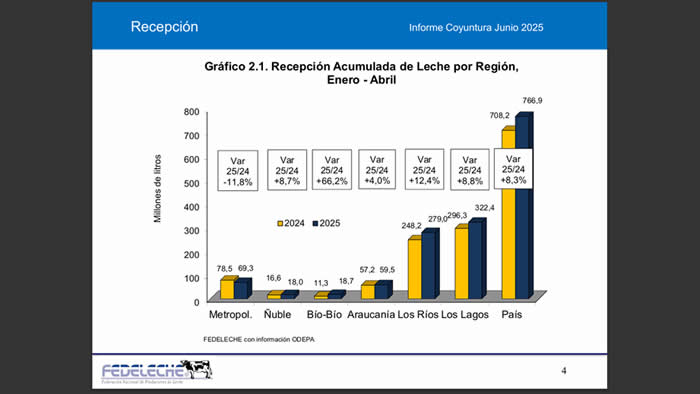 En la región de Los Lagos, la recepción de leche cruda se elevó un 10,4%, con un total de 74,6 millones de litros. Lo anterior, representa un aumento de 7,0 millones de litros frente al mismo mes de 2024.