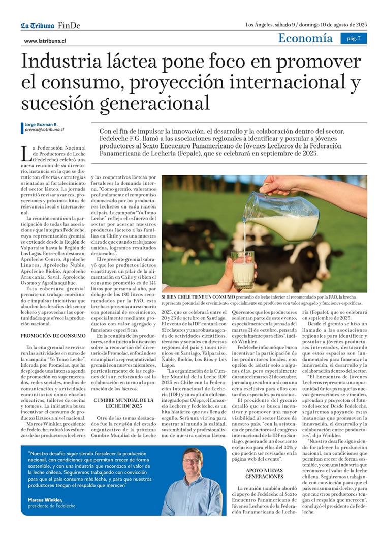 "Desde Fedeleche, seguiremos apoyando estas instancias que promueven la innovación, el desarrollo y la colaboración entre productores', dijo Winkler. 'Nuestro desafío sigue siendo fortalecer la producción nacional, con condiciones que permitan crecer de forma sostenible, y con una industria que reconozca el valor de la leche chilena. Seguiremos trabajando con convicción para que el país consuma más leche, y para que nuestros productores tengan el respaldo que merecen', concluyó el presidente de Fedeleche.