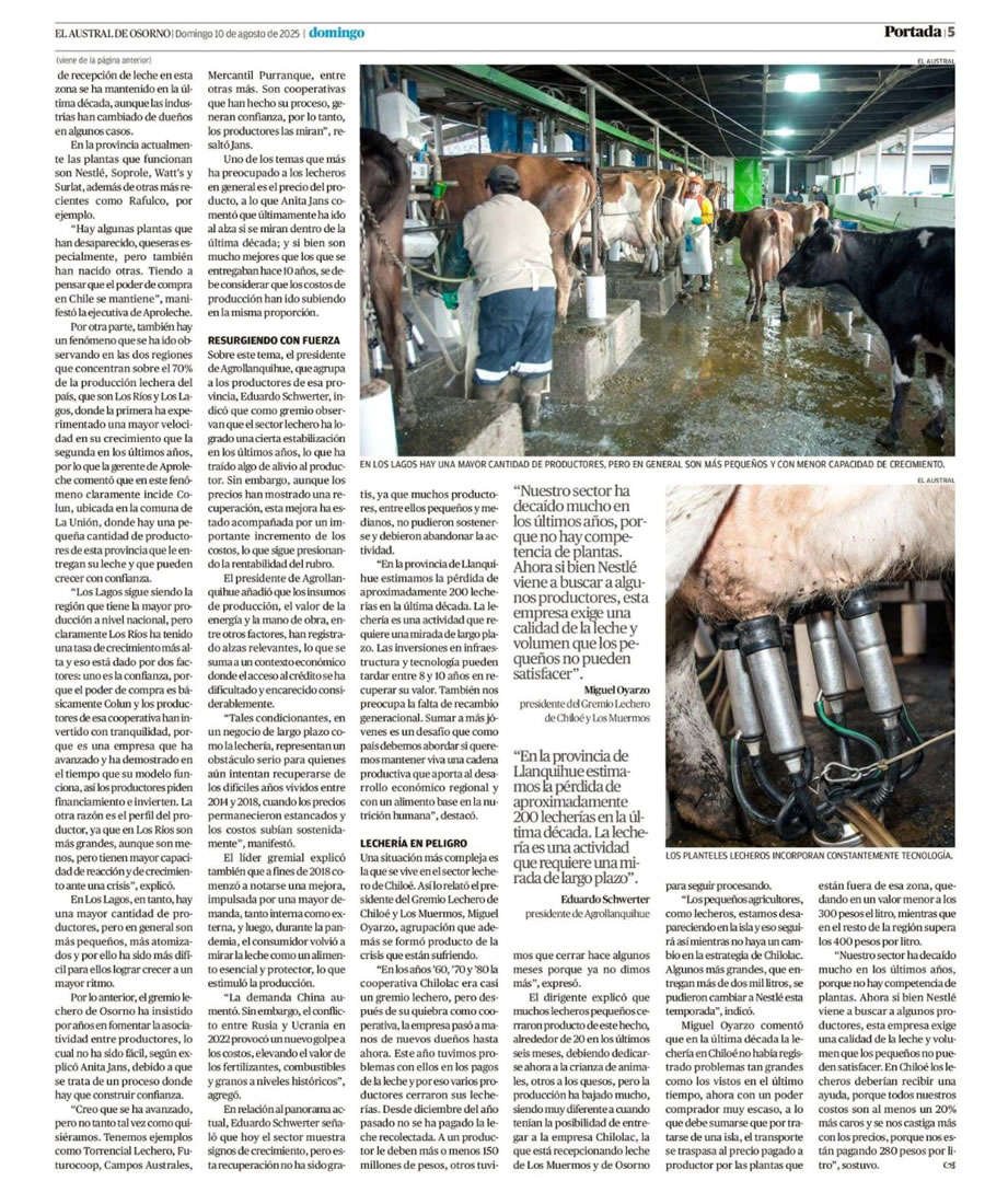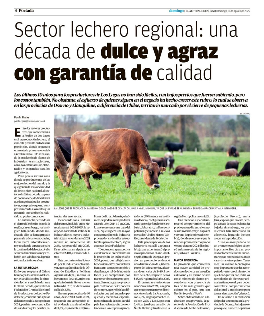 Osorno, 10 de agosto de 2025.- Entre los sectores productivos que caracterizan a la Región de Los Lagos está la producción lechera, el cual está presente en todas sus provincias, donde se genera una materia prima reconocida a nivel mundial. Ello le ha valido la instalación de plantas de industrias transnacionales, con altos estándares de elaboración y exigencias para los agricultores.