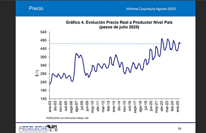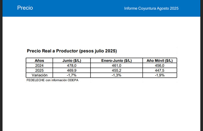 Los datos liberados por la Oficina de Estudios y Políticas Agrarias (Odepa), muestran que, a nivel nacional - el precio real por litro pagado al productor de leche de enero a junio de 2025 presentó una baja acumulada del 1,3% (-$5,87), pasando de $461,03 a $455,17 por litro.