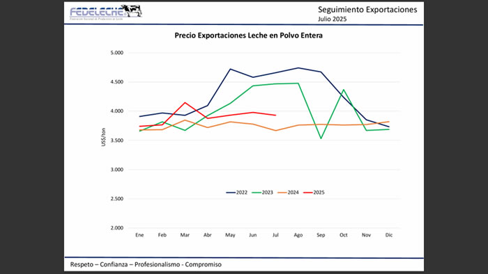 Uno de los productos con mejor desempeño ha sido la leche en polvo entera (LPE), cuyas exportaciones crecieron un 127% en comparación con 2024, alcanzando las 12.334 toneladas, el volumen más alto del último lustro. Los principales destinos de este producto fueron Brasil (41,0%), Colombia (23,2%), México (13,6%) y Cuba (10,5%).